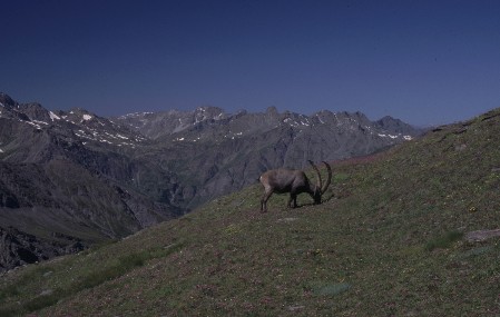 Stambecco in cima al monte Losetta; sfondo: i monti dell'alta valle Varaita