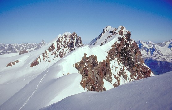 NERA (m. 4075) (Valtournanche val d'Ayas) Vista verso la Punta 4106 m. (ingiustamente innominata, visibile in primo piano) ed il Breithorn Orientale (in secondo piano). di Giuliano Tomasetti |