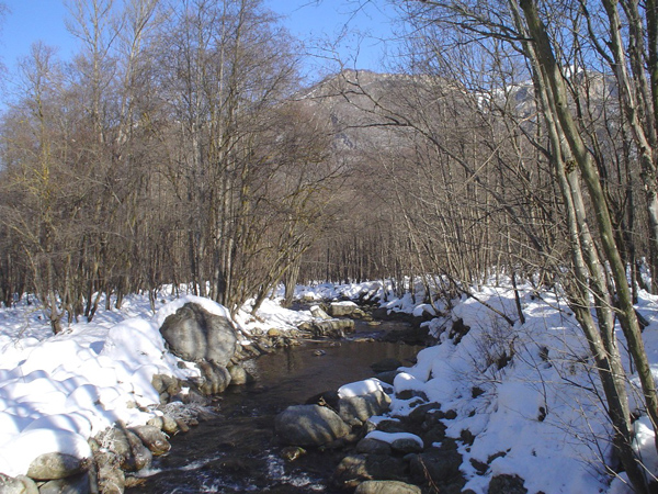 di fondo di ENTRACQUE - Centro fondo Gelas Pista OLTREGESSO Attraversamento del torrente Gesso, nel bosco di faggi. di Claudio Trova |