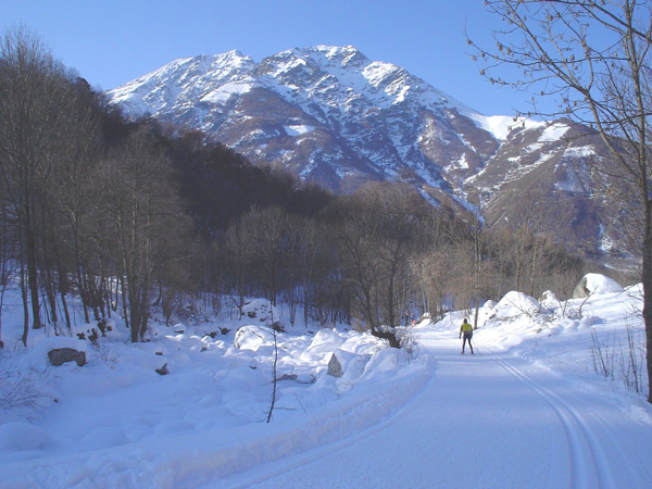 di fondo di ENTRACQUE - Centro fondo Gelas Pista SARTARIA La pista Sartaria ridiscende il vallone del rio Bousset: sullo sfondo il gruppo del monte Ray, ai lati il bosco di faggi. di Claudio Trova |