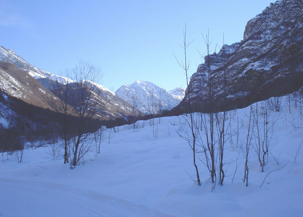 di fondo di ENTRACQUE - Centro fondo Gelas Pista SARTARIA La parte pił alta della pista Sartaria, ormai al ponte Porcera, nel Parco delle Alpi Marittime. Sullo sfondo l'alto vallone del Bousset, con la cima Plisser. di Claudio Trova |