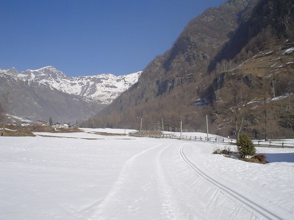 di fondo di OLLOMONT Valle di Ollomont La pista sale oltre le ultime case di Rey, sullo sfondo del Gran Combin (a sinistra), Quattromila già in territorio svizzero; si intravedono anche le case di Vouéce. di Claudio Trova |