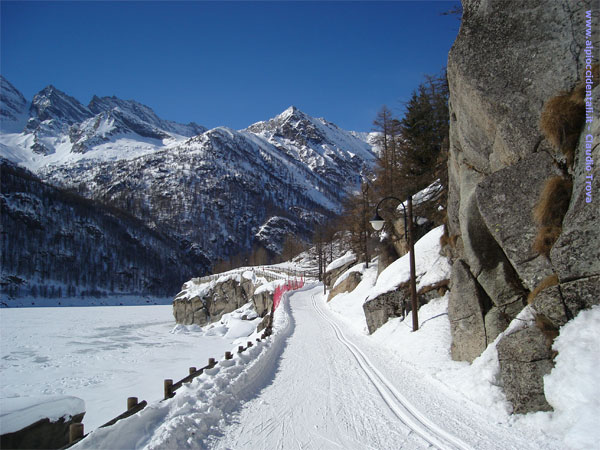 Il tratto dell'anello Lungolago (sponda idrografica sinistra) che si sviluppa in un passaggio obbligato tra le case del capoluogo ed il bacino artificiale, a picco sulle acque del lago.