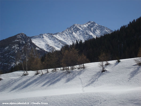 Sullo sfondo la dorsale che sale dal Montzeuc (a sinistra) verso la punta Fenilia, verso destra.