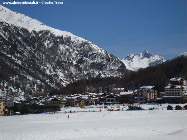 Le piste sul Prato di Sant'Orso sullo sfondo di Cogne. Oltre la costa ricoperta di larici alle spalle del paese, spiccano le cime del vallone di Urtier.