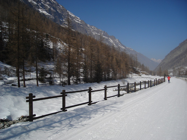 di fondo di DEGIOZ Valsavarenche La pista scende da Bien verso Degioz passando accanto al torrente Savara; in lontananza, dove la Valsavarenche sfuma verso la valle principale della Dora Baltea, appare il gruppo del mont Fallère. di Claudio Trova |
