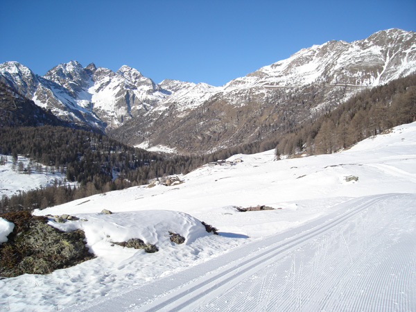 di fondo di LIGNAN - PORLIOD - CHAMPCOMBRE (Valle di Saint Barthélemy ) Dalla parte più alta della pista nera di Pierrey si gode ampio panorama sull'alta valle di Saint Barthélemy, con la Becca di Luseney; l'anello di Ollière si distende nei pendii nevosi che si intravedono quasi al fondo della vallata. di Claudio Trova |