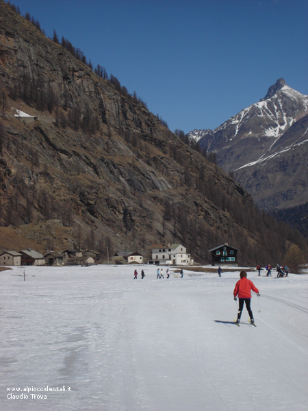 di fondo di PONT VALSAVARENCHE (Valsavarenche) Campi di neve attorno alle case di Pont, nel tratto finale della pista, sullo sfondo del Grand Nomenon (m. 3488).