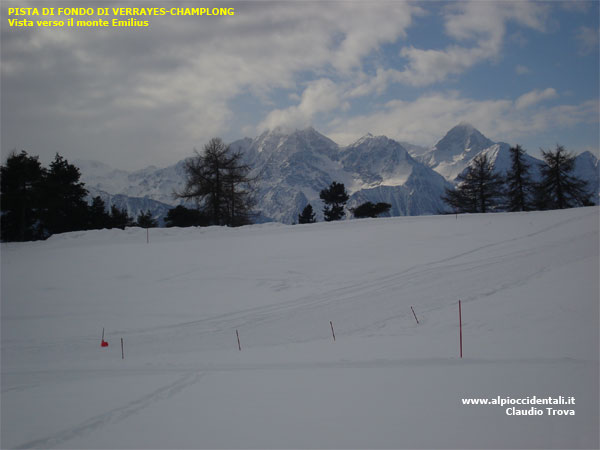 Il monte Emilius (il pił alto a destra) visto dalla pista di fondo di Verrayes-Champlong (anello verde).