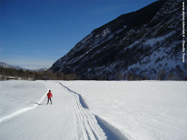 Tornando da Pratolungo verso Vinadio, il tracciato della pista di fondo attraversa aperti e soleggiati campi di neve.