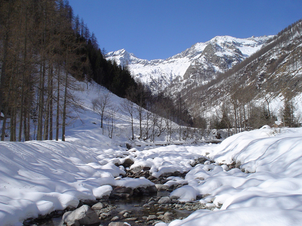 di fondo di CARCOFORO Valsesia Inizio della pista Nera: l'attraversamento del torrente Egua. Sullo sfondo: il vallone verso l'alpe Le Coste, con il Pizzo Montevecchio. di Claudio Trova |