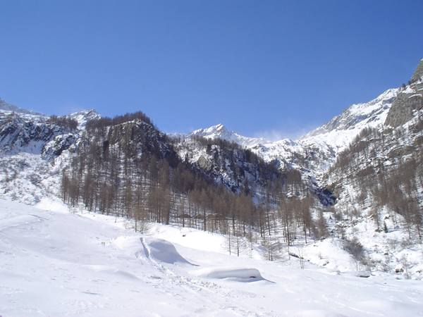 di fondo di CARCOFORO Valsesia Giunti nella parte pių alta della pista Nera, cosė appare verso SW la catena spartiacque tra la Cima del Tiglio (verso sinistra) ed il colle del Termo (verso destra). di Claudio Trova |