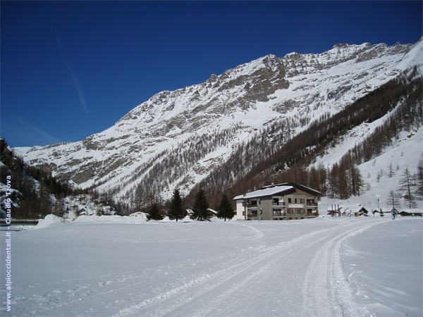 L'anello di 1 km (visibile nella foto) che si sviluppa attorno al rifugio Mila, si identifica in parte con l'anello Lungolago: il tracciato si trova nella parte pił a monte del centro fondo di Ceresole, presso il rifugio Massimo Mila (visibile quasi al centro dell'immagine, sullo sfondo del Mare Percia).