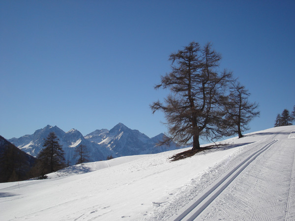 di fondo di LIGNAN - PORLIOD - CHAMPCOMBRE (Valle di Saint Barthélemy ) Il tratto iniziale della pista rossa che scende a Champcombre, sullo sfondo del monte Emilius (al centro) e della Becca di Nona (l'ultima cima a destra). di Claudio Trova |