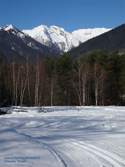 di fondo di SANTA MARIA MAGGIORE (Val Vigezzo) Uscendo dai soleggiati campi di neve non lontano da Malesco, tornando verso Santa Maria Maggiore, non mancano alcuni scorci sul Pizzo La Scheggia (m. 2466), principale cima della val Vigezzo, visibile al centro dell'immagine. In primo piano si