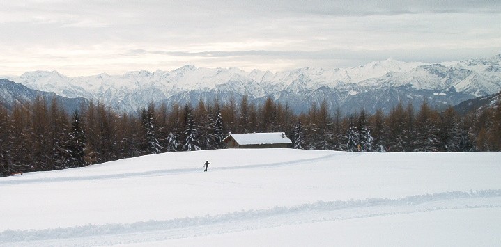 Il tracciato attraversa ampi campi di neve e boschetti di larici ed abeti.